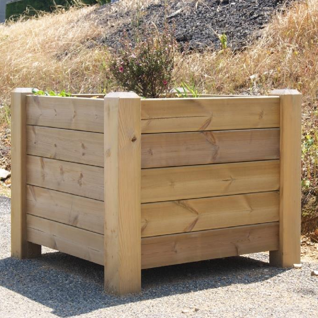UD. de jardinera para su uso en jardines o parques, fabricada con tabla de pino rojo tratado en autoclave, clase de riesgo IV, tabla de 22 mm de espesor, y pilares esquineros de 9,5×9,5 cm. CONSULTAR PRECIOS.