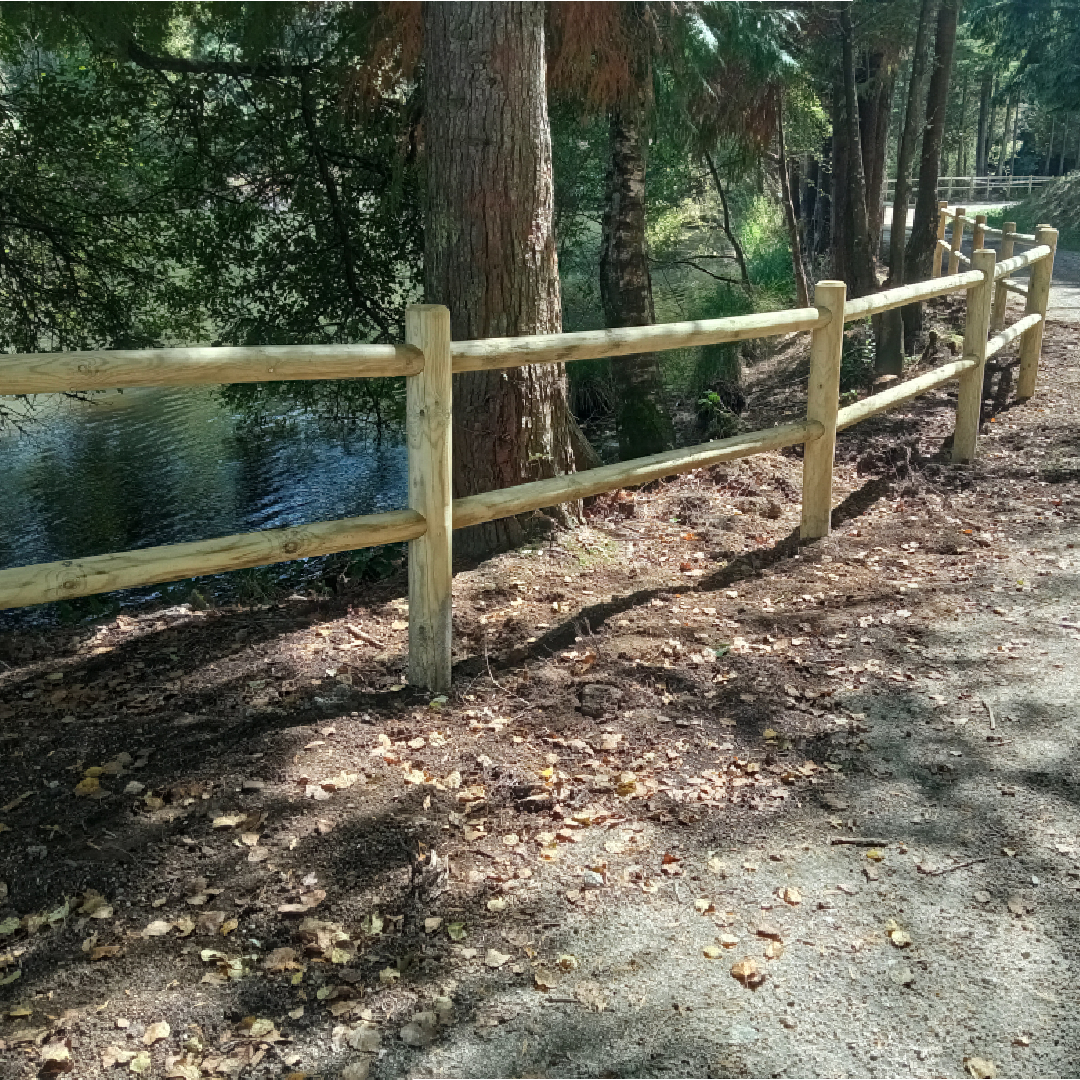 m.l. de Valla de madera de pino tratado en autoclave, nivel IV, con cilindrados verticales de diámetro 12 cm, y longitud 140 cm, y cilindrados horizontales escastrados de diámetro 8 cm, y longitud 200 cm. CONSULTAR PRECIOS.